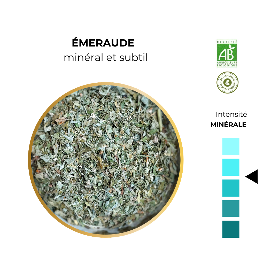 Cueillies à la main dans des milieux préservés et labellisés bio, les plantes sauvages sont fermentées, torréfiées ou fumées pour sublimer leurs arômes. Parallèlement, certaines plantes aromatiques sont produites à la ferme. Au total, 15 plantes ont été sélectionnées avec soin pour leurs profils gustatifs et médicinaux. Ces plantes sont ensuite séchées puis assemblées pour proposer des bouquets aromatiques harmonieux. Ni additif, ni arôme artificiel ne sont ajoutés. Vous ne découvrirez que les véritables saveurs des plantes !